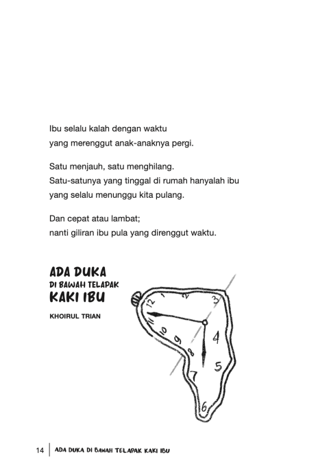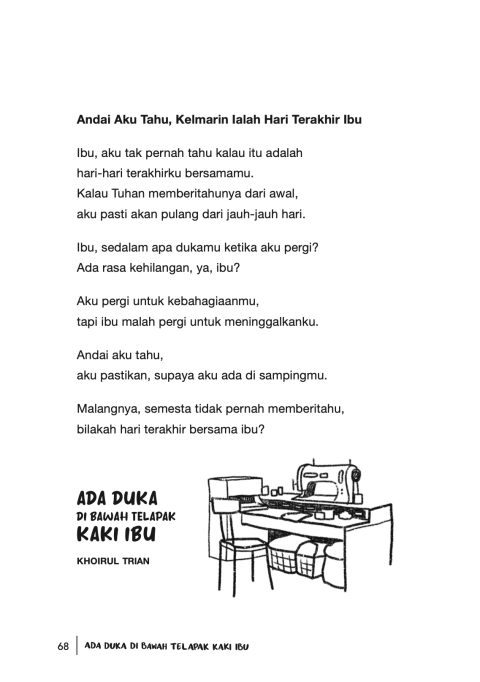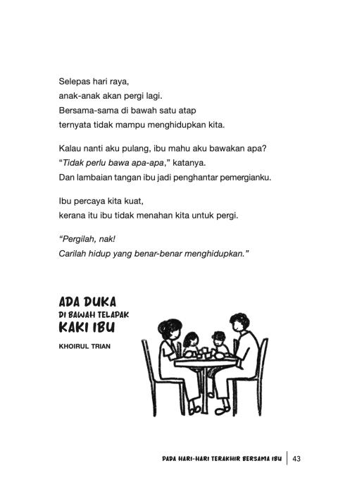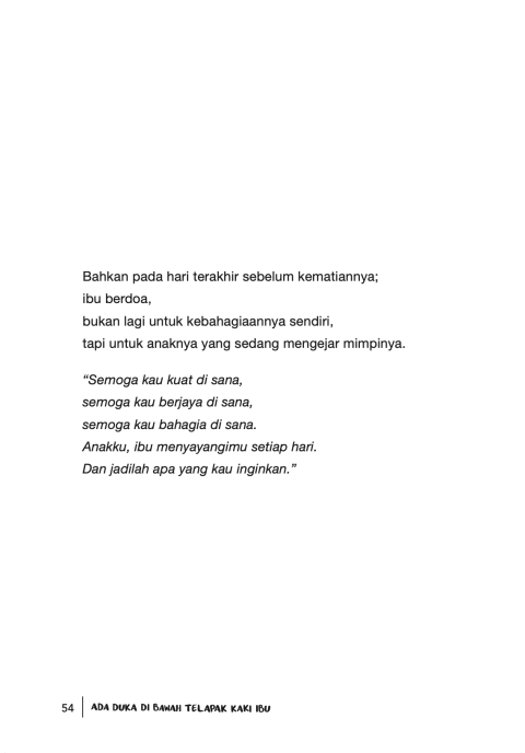 Belum sempat aku memberikan bahagia, tapi justeru menambah lara. Maaf, sudah menyeksamu dengan rindu dan kepulanganku jadi hari yang selalu ibu tunggu. Maaf langkahku terlalu jauh, sampai lupa ibu sendiri yang akan runtuh.