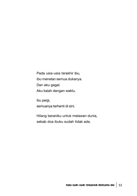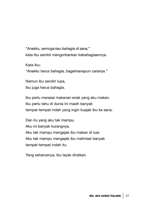 Rumahku masih bernama ibu. Atap-atapnya masih usapan lembut pada rambutku, yang disela-selanya selalu terselit harapan untukku. Dan kali ini, aku pulangkan semua mimpimu untuk hidupku ya, ibu.
