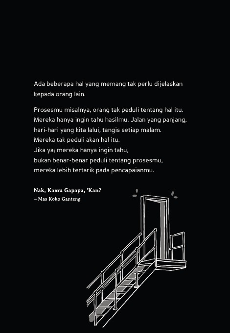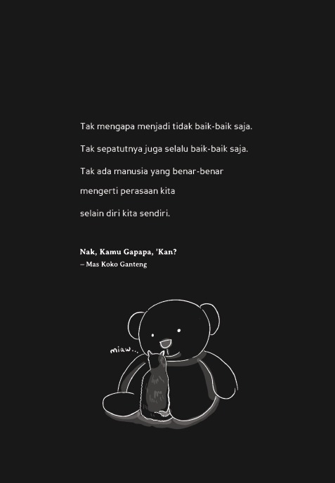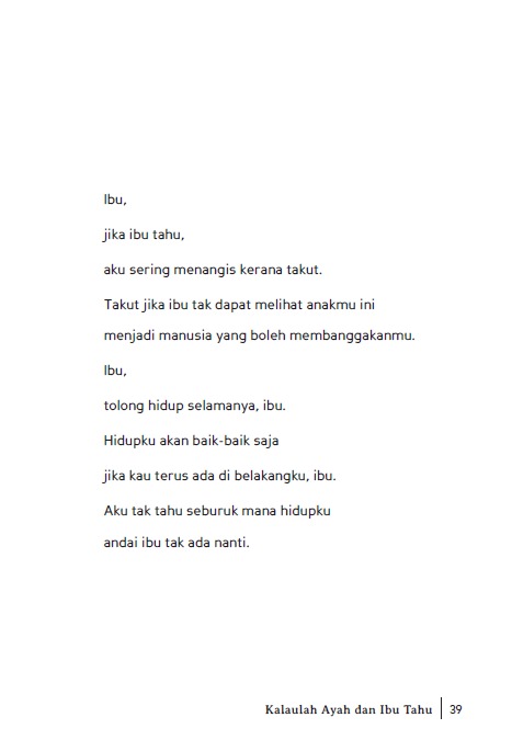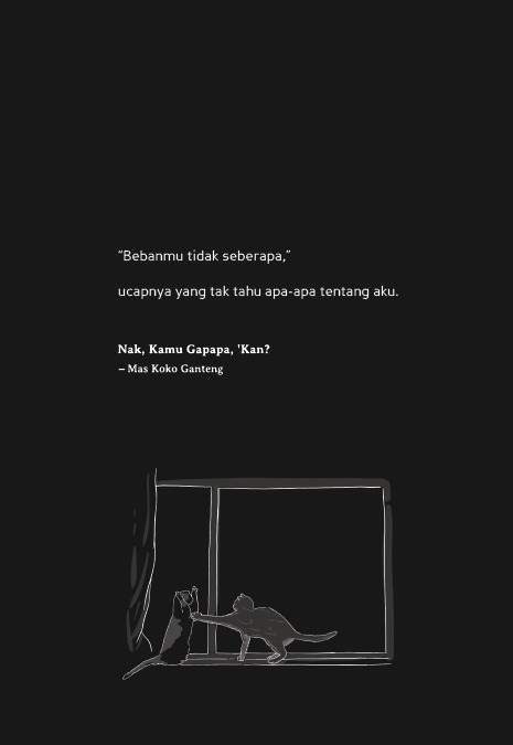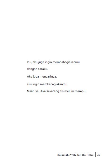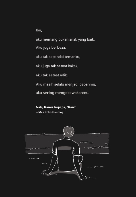 Ayah, ibu, andai saja kalian tahu, aku hanya ingin didengar. Aku hanya ingin merasakan suasana rumah yang hangat. Aku hanya ingin memiliki gambar keluarga kita terpampang di rumah. Namun, rumah seharusnya jadi tempat yang nyaman untuk pulang, malah terasing untukku. Tidak ada yang mahu mendengarku. Tidak ada yang menemaniku ketika aku membesar. Aku sendirian.