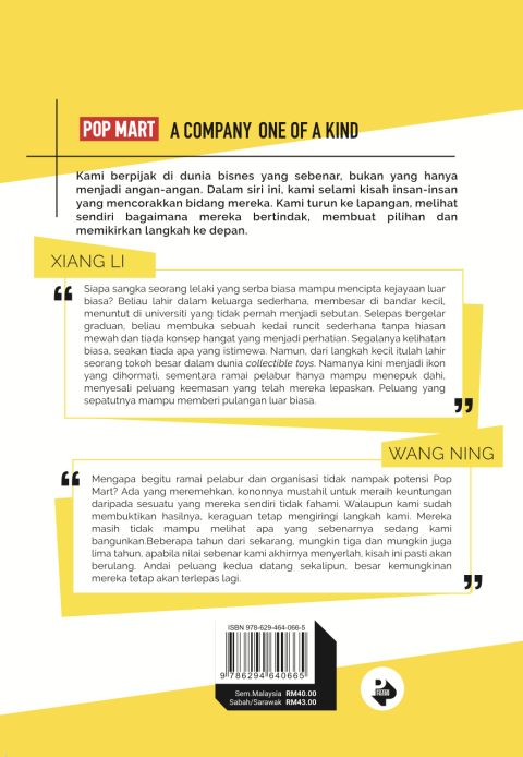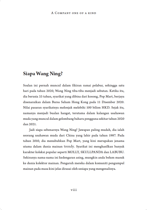 WANG NING: "Mengapa begitu ramai pelabur dan organisasi tidak nampak potensi Pop Mart? Ada yang meremehkan, kononnya mustahil untuk meraih keuntungan daripada sesuatu yang mereka sendiri tidak fahami. Walaupun kami sudah membuktikan hasilnya, keraguan tetap mengiringi langkah kami. Mereka masih tidak mampu melihat apa yang sebenarnya sedang kami bangunkan.Beberapa tahun dari sekarang, mungkin tiga dan mungkin juga lima tahun, apabila nilai sebenar kami akhirnya menyerlah, kisah ini pasti akan berulang. Andai peluang kedua datang sekalipun, besar kemungkinan mereka tetap akan terlepas lagi."