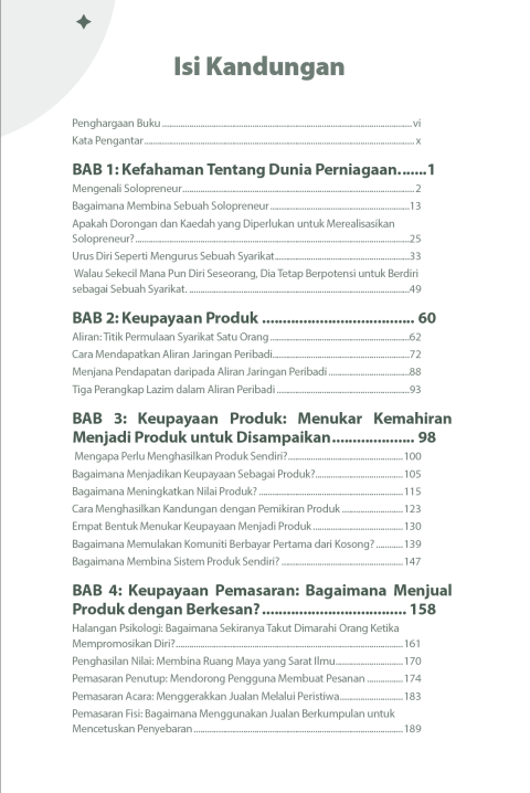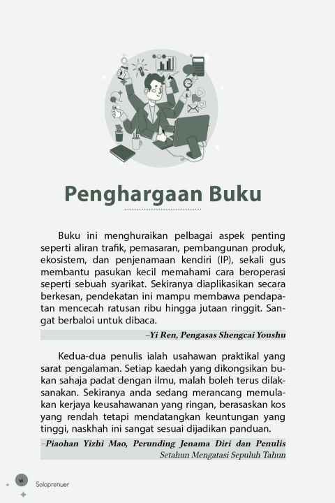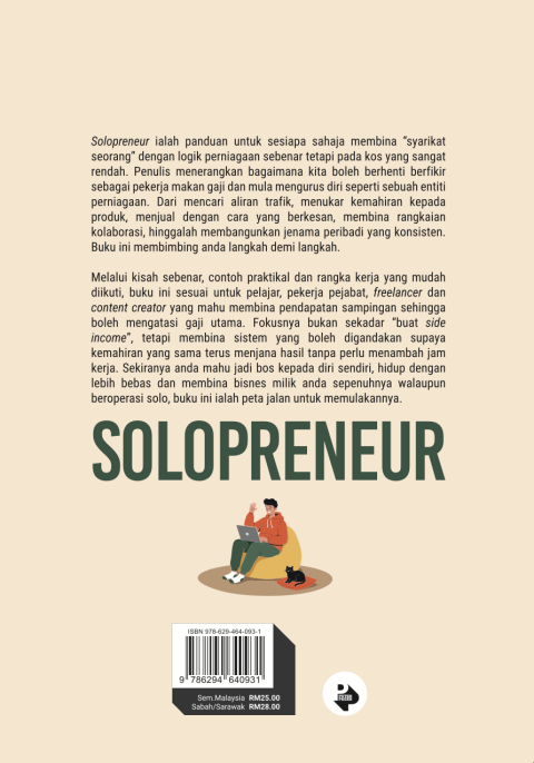 Solopreneur ialah panduan untuk sesiapa sahaja membina "syarikat seorang" dengan logik perniagaan sebenar tetapi pada kos yang sangat rendah. Penulis menerangkan bagaimana kita boleh berhenti berfikir sebagai pekerja makan gaji dan mula mengurus diri seperti sebuah entiti perniagaan. Dari mencari aliran trafik, menukar kemahiran kepada produk, menjual dengan cara yang berkesan, membina rangkaian kolaborasi, hinggalah membangunkan jenama peribadi yang konsisten.Buku ini membimbing anda langkah demi langkah.